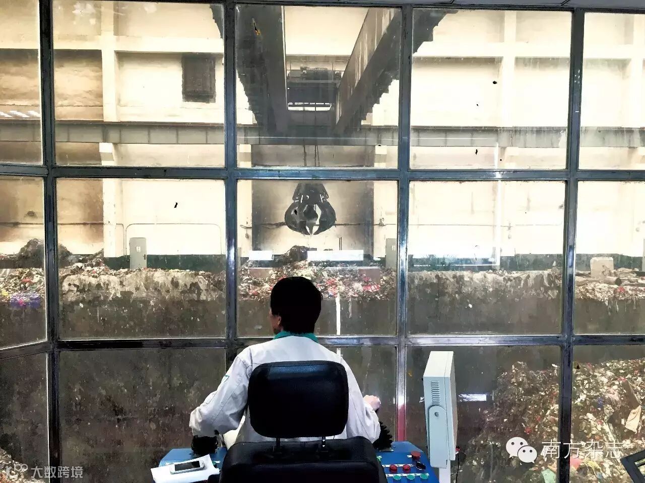 澄海洁源垃圾发电厂,操作垃圾贮坑抓斗的工作人员亦无须戴口罩。(南方杂志图)