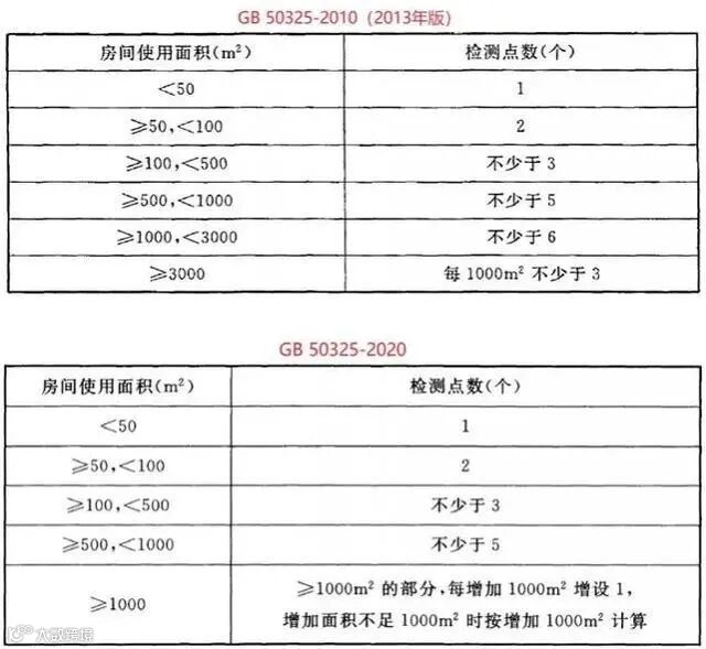 对室内污染物浓度检测点数设置进行了调整。新标准中调整了使用面积大于1000m²的房间检测点数设置。每增加1000 m²增设1个点,增加面积不足1000 m²时按增加1000 m²计算。
