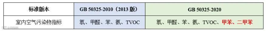 GB 50325-2010(2013年版)中室内空气污染物有5种(氡、甲醛、苯、氨、TVOC),新标准在原标准的基础上增加了甲苯和二甲苯,合计7种。实际上氡污染从过去的一种222,增加到两种氡-222和氡-220,还有室内环境新风量的测试。