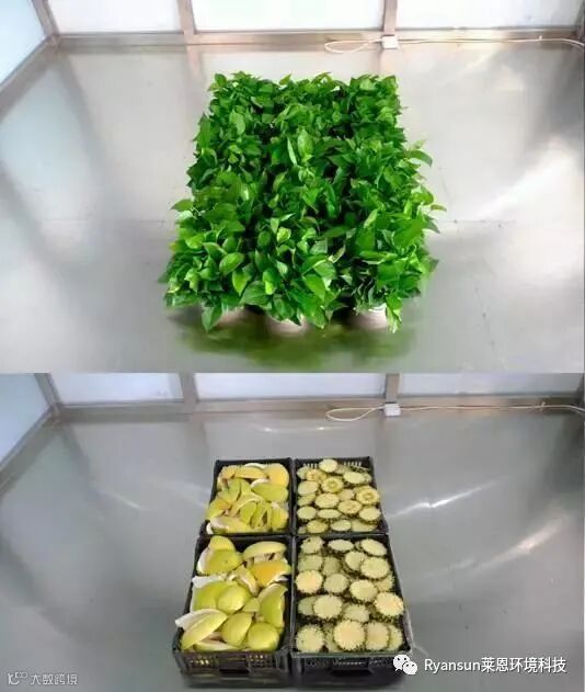 很多人都在家装、冬季雾霾严重时在家中和办公室摆一些绿萝和果皮,对这种市场上10块、20块的植物及果皮在空气净化上的作用近乎膜拜,所以我们一定要测试它们,在12.24㎡的实验舱内分别放上15盆绿萝和4筐果皮,测试时间为24小时。