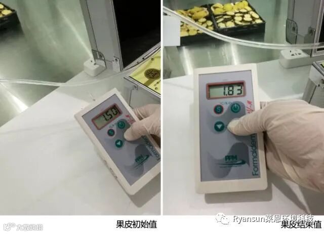 绿萝和果皮的测试初始浓度统一达到大约1.4-1.5 mg/m³左右的甲醛浓度值,这可是安全标准的17倍之多!