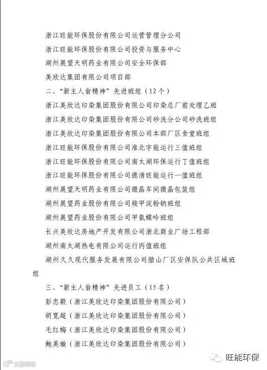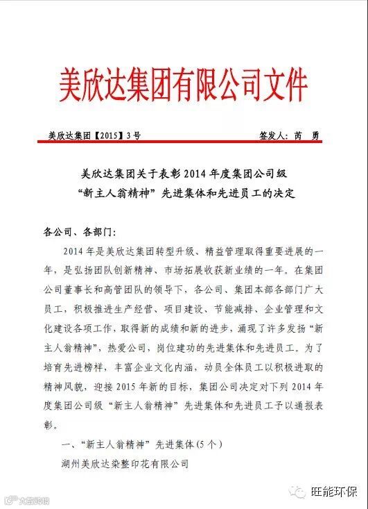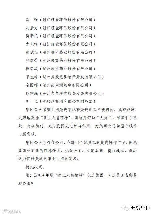 在此辞旧迎新之际,美欣达集团公司为了培育、树立先进榜样,在企业内部形成“比学赶帮超”氛围,动员全体员工以更为积极进取的精神风貌,迎接2015年新的挑战。现决定对浙江旺能运营管理分公司及投资与服务中心颁发2014年度集团公司级"新主人翁精神"先进集体。