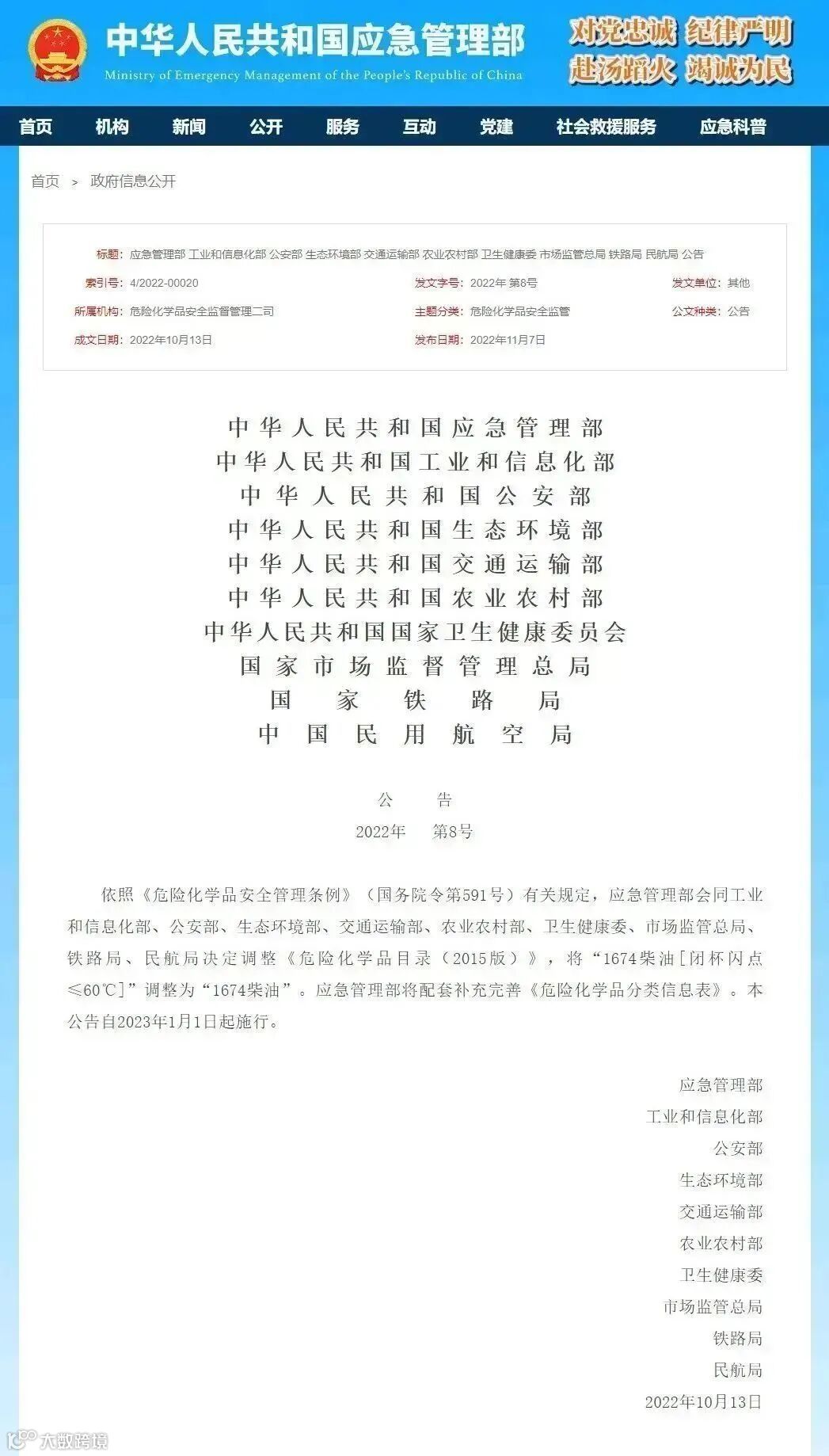 依照《危险化学品安全管理条例》(国务院令第591号)有关规定,应急管理部会同工业和信息化部、公安部、生态环境部、交通运输部、农业农村部、卫生健康委、市场监管总局、铁路局、民航局决定调整《危险化学品目录(2015版)》,将“1674柴油[闭杯闪点≤60℃]”调整为“1674柴油”。应急管理部将配套补充完善《危险化学品分类信息表》。本公告自2023年1月1日起施行。