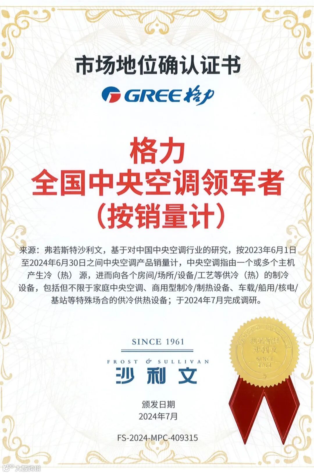 近日,权威专业媒体i传媒《暖通空调与热泵》发布《2024H1中国中央空调行业发展报告》,系统展示了上半年国内中央空调市场的发展状况。报告显示,格力以15%的销售规模占有率稳居市场第一名。与此同时,弗若特沙利文调研机构向格力颁发《市场地位确认证书》,认定格力“全国中央空调领军者”市场地位。目前,格力中央空调已连续12年市场占有率居全国第一。