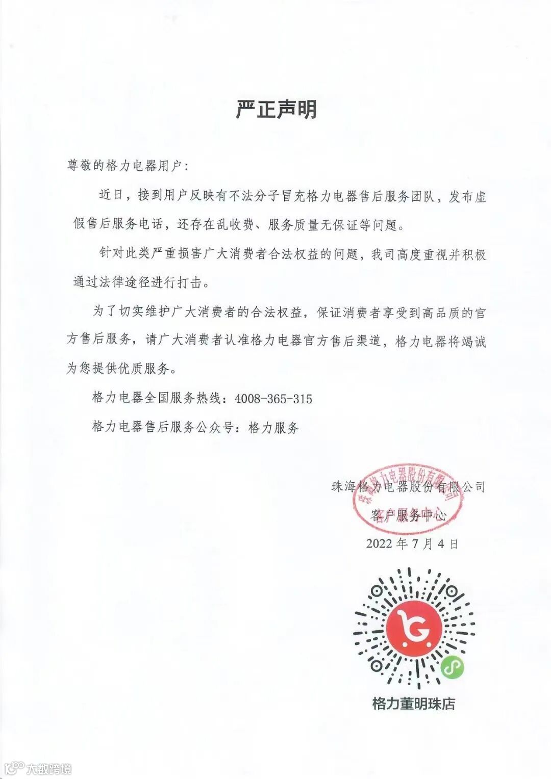 近日,接到用户反映有不法分子冒充格力电器售后服务团队,发布虚假售后服务电话,还存在乱收费、服务质量无保证等问题。