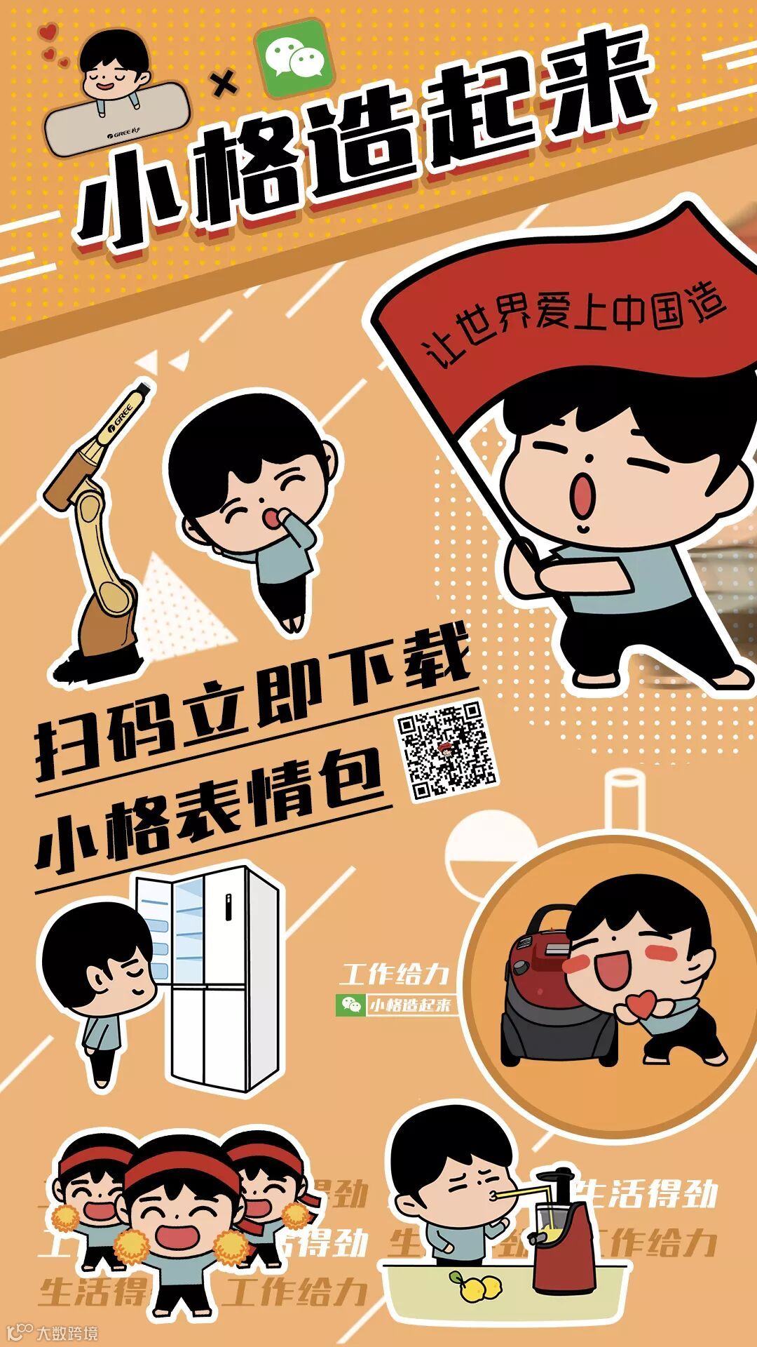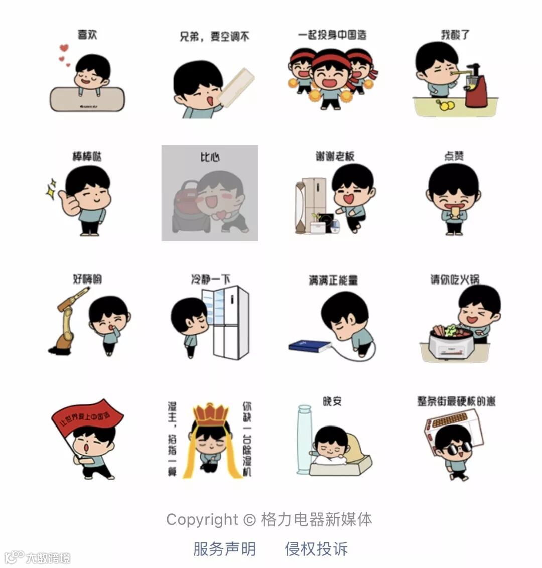 格力人化身呆萌小格,结合生活工作小场景,与格力产品“亲密互动”,用16个表情包生动演绎格力人“投身中国造”的工作精神和积极向上的生活态度。
