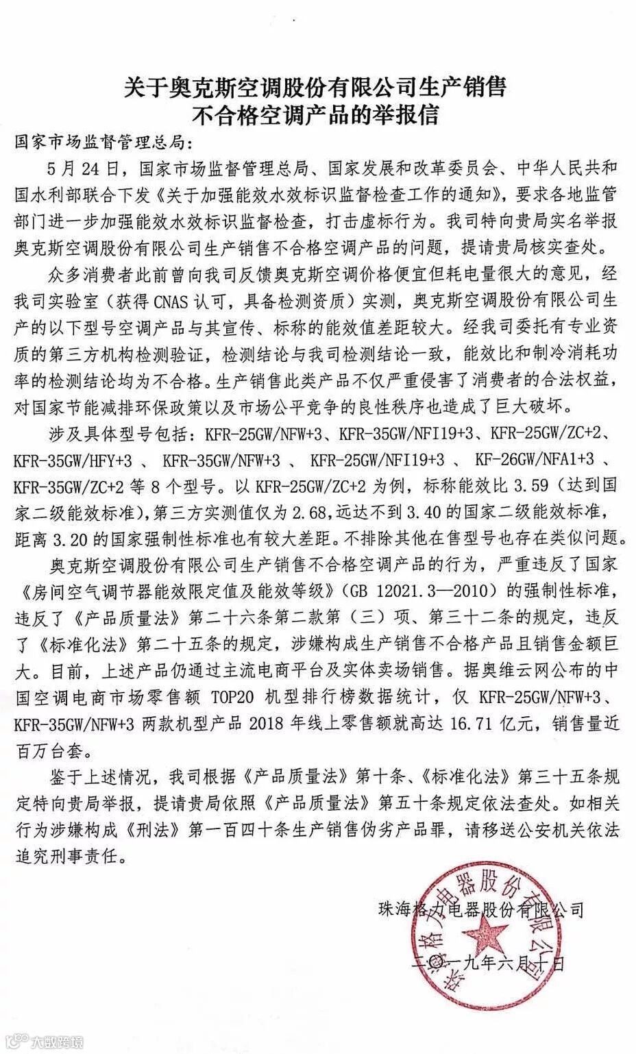 5月24日,国家市场监督管理总局、国家发展和改革委员会、中华人民共和国水利部联合下发《关于加强能效水效标识监督检查工作的通知》,要求各地监管部门进一步加强能效水效标识监督检查,打击虚标行为。我司特向贵局实名举报奥克斯空调股份有限公司生产销售不合格空调产品的问题,提请贵局核实查处。