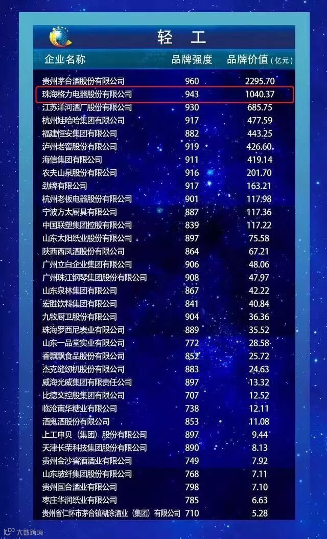 格力电器在轻工行业排名第二,家电行业位居第一,格力凭借自主创新精神和“完美质量”模式彰显品牌影响力,诠释了中国品牌力量。