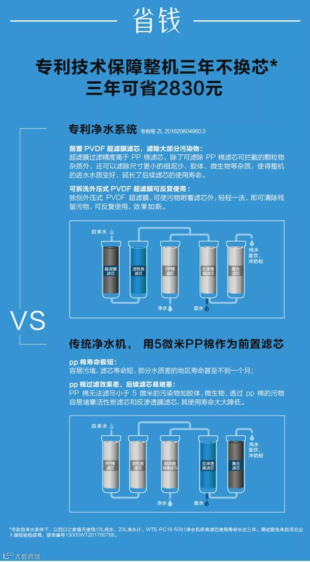 整机三年不换芯,按照普通净水机换滤芯费用计算,三年可省2830元,再也不用吐槽每年花巨额维护费。