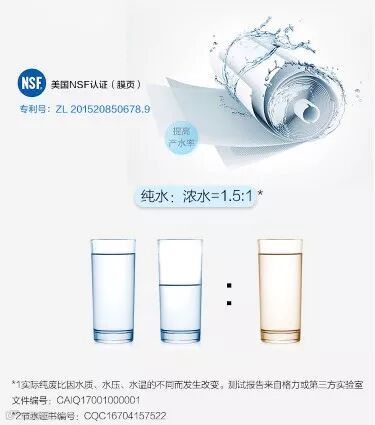 格力WTE-PC16-5081净水机不仅省芯,还省水费。采用多膜页卷膜技术,增大反渗透膜滤芯通量方式,提高回收率,实现纯水/废水为1.5:1。某品牌买家吐槽净水机纯废比为1:2费水费钱。以后请认准格力WTE-PC16-5081净水机,节水提升,环保更省钱。(1.5:1测试报告来自中国检验检疫科学研究院综合检测中心,报告编号CAIQS0017002956001,实际运行纯废比因水温、水压、水质不同而不同。)