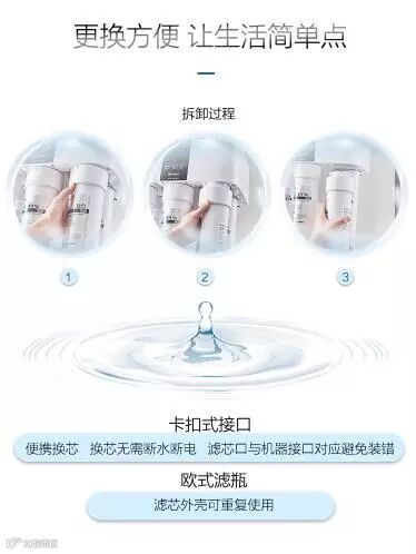 卡扣式接口,滤芯拆卸方式简单便捷,无需断水断电,滤芯口与机器接口一一对应,避免装错滤芯影响过滤效果。同时,滤芯外壳可以重复使用。