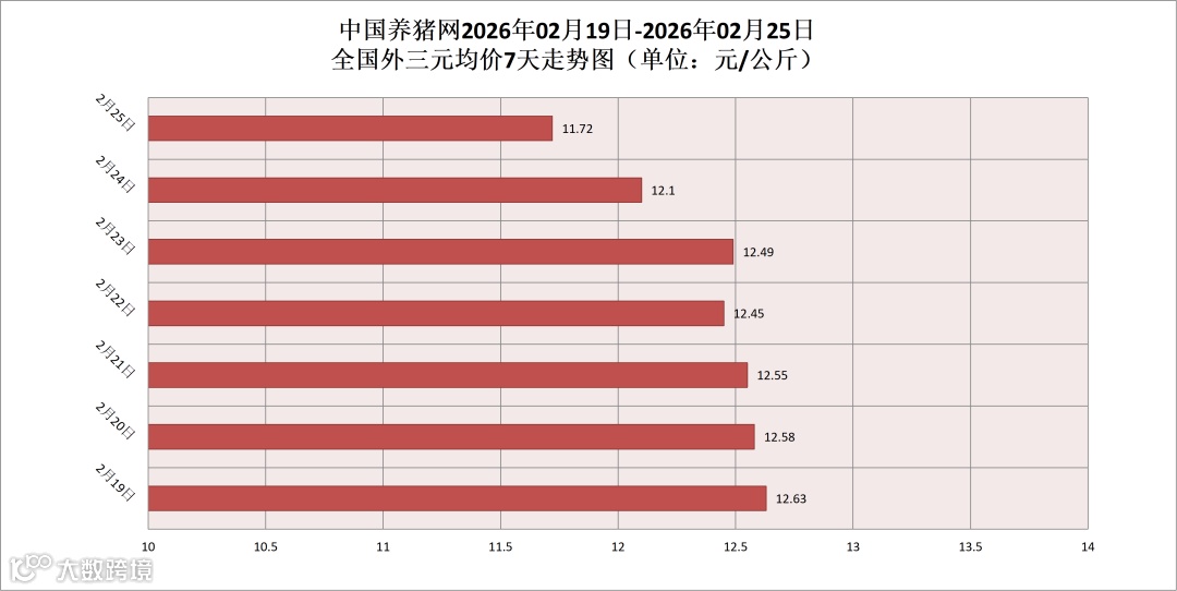 2026年02月25日(星期三),据中国养猪网猪价系统监测,全国外三元均价为11.72元/公斤,猪价较昨日(12.1元/公斤)下跌0.38元/公斤,较上月(13.07元/公斤)下跌了1.35元/公斤。