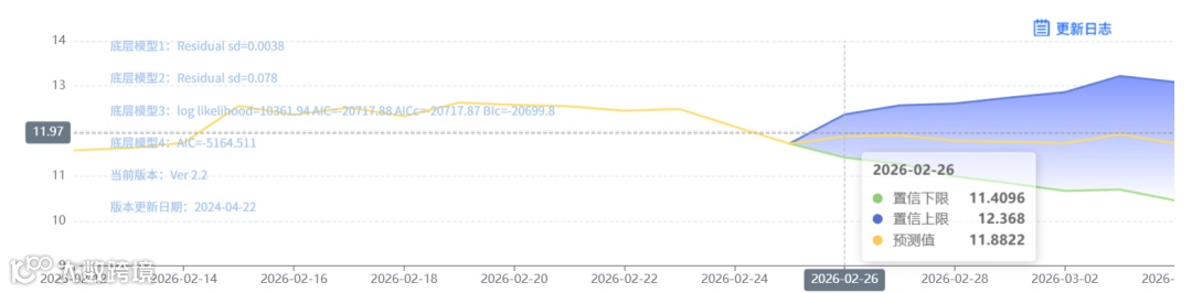 玄田算法是由项目课题组团队原创的非经典逻辑数值聚合理论和不确定性预测方法,构建了基于一致模算子的生猪价格预测模型。该模型采用的聚合函数及一致模相关理论与方法已获得多项国家自然科学基金和省级自然科学资金资助,并获得多项省级自然科学奖奖项。2月26日预测猪价为11.8822,置信区间在11.4096--12.368之间。02月27日预测猪价为11.9049;02月28日预测猪价为11.7835。