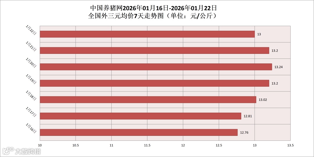 2026年01月22日(星期四),据中国养猪网猪价系统监测,全国外三元均价为13元/公斤,猪价较昨日(13.20元/公斤)下跌0.20元/公斤,较上月(11.47元/公斤)上涨了1.53元/公斤。