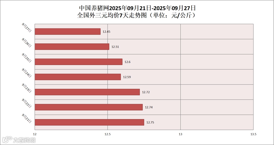 2025年09月27日(星期六),据中国养猪网猪价系统监测,全国外三元均价为12.45元/公斤,猪价较昨日(12.51元/公斤)下跌了0.6元/公斤,较上月(1368元/公斤)下跌了1.23元/公斤。
