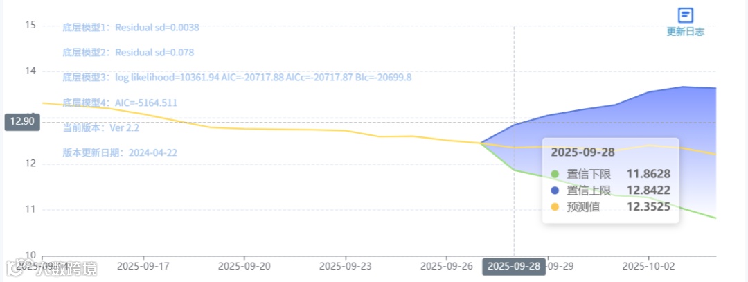 玄田算法是由项目课题组团队原创的非经典逻辑数值聚合理论和不确定性预测方法,构建了基于一致模算子的生猪价格预测模型。该模型采用的聚合函数及一致模相关理论与方法已获得多项国家自然科学基金和省级自然科学资金资助,并获得多项省级自然科学奖奖项。09月28日预测猪价为12.3525,置信区间在11.8628--12.8422之间。09月29日预测猪价为12.3752;09月30日预测猪价为12.3392。