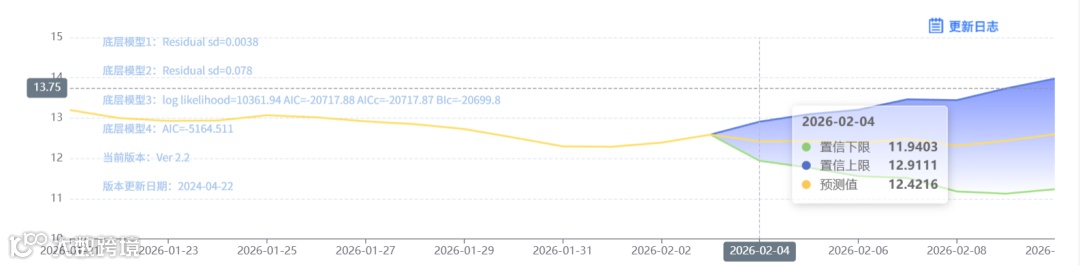 玄田算法是由项目课题组团队原创的非经典逻辑数值聚合理论和不确定性预测方法,构建了基于一致模算子的生猪价格预测模型。该模型采用的聚合函数及一致模相关理论与方法已获得多项国家自然科学基金和省级自然科学资金资助,并获得多项省级自然科学奖奖项。02月04日预测猪价为12.4216,置信区间在11.9403--12.9111之间。02月05日预测猪价为12.4295;02月06日预测猪价为12.3751。