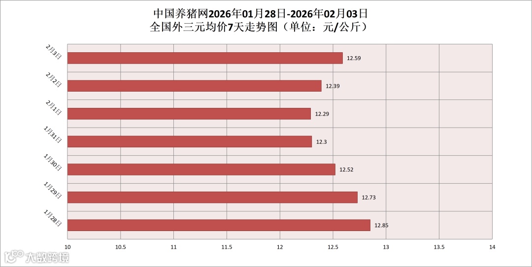 2026年02月03日(星期二),据中国养猪网猪价系统监测,全国外三元均价为12.59元/公斤,猪价较昨日(12.39元/公斤)上涨0.20元/公斤,较上月(12.69元/公斤)下跌了0.10元/公斤。