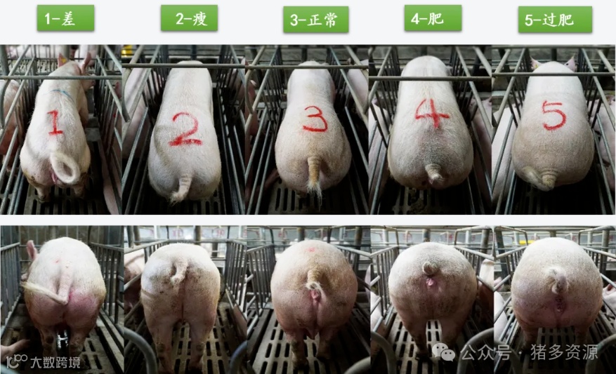 使用BCS系统(1-5分,3-3.5分为最佳)或测量背脂厚度(理想12-16mm)来判断肥胖程度。如果母猪BCS>3.5或背脂>18mm,即视为过胖。