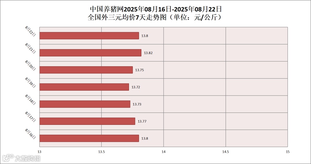 2025年08月22日(星期五),据中国养猪网猪价系统监测,全国外三元均价为13.80元/公斤,猪价较昨日(13.82元/公斤)下跌了0.02元/公斤,较上月(14.44元/公斤)下跌了0.64元/公斤。