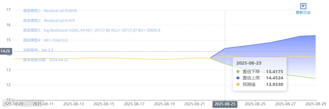 玄田算法是由项目课题组团队原创的非经典逻辑数值聚合理论和不确定性预测方法,构建了基于一致模算子的生猪价格预测模型。该模型采用的聚合函数及一致模相关理论与方法已获得多项国家自然科学基金和省级自然科学资金资助,并获得多项省级自然科学奖奖项。08月23日预测猪价为13.9330,置信区间在13.4175--14.4524之间。08月24日预测猪价为13.8732;08月25日预测猪价为13.8352。