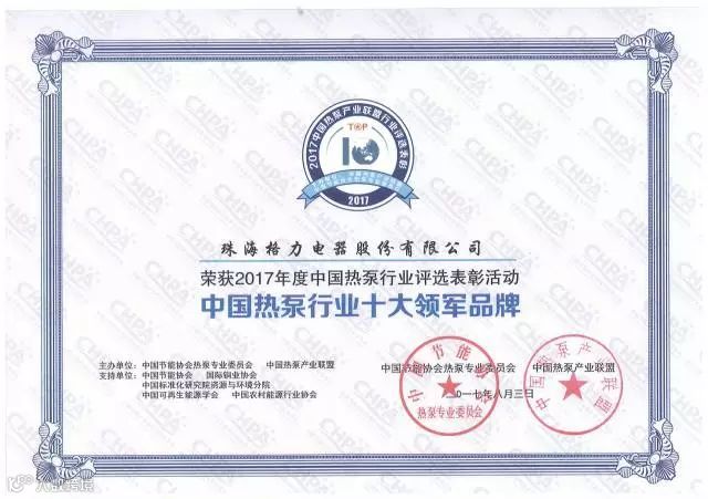 8月,2017中国热泵产业联盟年会暨第六届亚洲空气源热泵论坛,格力电器获颁“中国热泵行业十大领军品牌”。