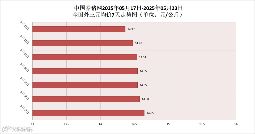 2025年05月23日(星期五),据中国养猪网猪价系统监测,全国外三元均价为14.37元/公斤,猪价较昨日(14.48元/公斤)下跌了0.11元/公斤,较上月(15.05元/公斤)下跌了0.68元/公斤。