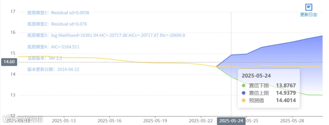 玄田算法是由项目课题组团队原创的非经典逻辑数值聚合理论和不确定性预测方法,构建了基于一致模算子的生猪价格预测模型。该模型采用的聚合函数及一致模相关理论与方法已获得多项国家自然科学基金和省级自然科学资金资助,并获得多项省级自然科学奖奖项。05月24日预测猪价为14.4014,置信区间在13.8767--14.9379之间。05月25日预测猪价为14.2622;05月26日预测猪价为14.4315。