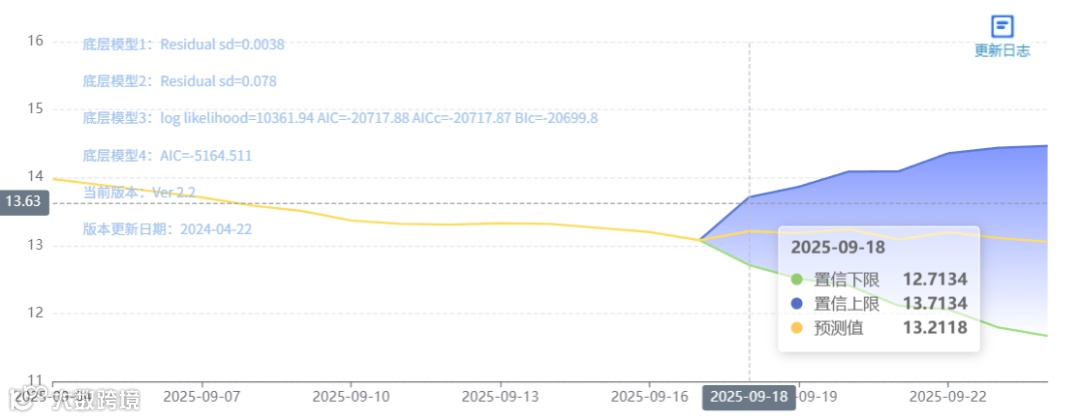 玄田算法是由项目课题组团队原创的非经典逻辑数值聚合理论和不确定性预测方法,构建了基于一致模算子的生猪价格预测模型。该模型采用的聚合函数及一致模相关理论与方法已获得多项国家自然科学基金和省级自然科学资金资助,并获得多项省级自然科学奖奖项。09月18日预测猪价为13.2118,置信区间在12.7134—13.7134之间。09月19日预测猪价为13.1854;09月20日预测猪价为13.2430。