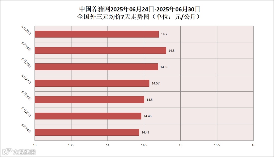 2025年06月30日(星期一),据中国养猪网猪价系统监测,全国外三元均价为14.70元/公斤,猪价较昨日(14.80元/公斤)下跌了0.10元/公斤,较上月(14.50元/公斤)上涨了0.20元/公斤。