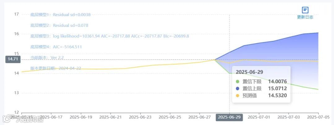 玄田算法是由项目课题组团队原创的非经典逻辑数值聚合理论和不确定性预测方法,构建了基于一致模算子的生猪价格预测模型。该模型采用的聚合函数及一致模相关理论与方法已获得多项国家自然科学基金和省级自然科学资金资助,并获得多项省级自然科学奖奖项。06月29日预测猪价为14.5320,置信区间在14.0076--15.0712之间。06月30日预测猪价为14.6974;07月01日预测猪价为14.6610。