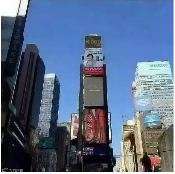 “世界十字路口”--美国纽约“时代广场”,格力电器及格力电器董事长董明珠女士的大幅宣传画面。