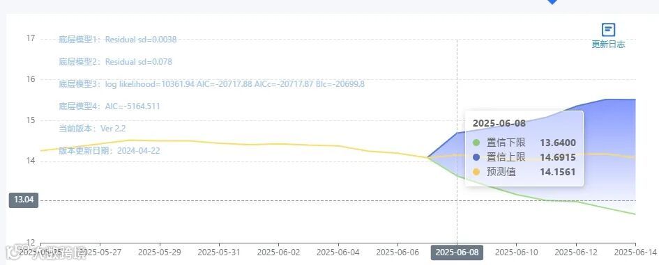 玄田算法是由项目课题组团队原创的非经典逻辑数值聚合理论和不确定性预测方法,构建了基于一致模算子的生猪价格预测模型。该模型采用的聚合函数及一致模相关理论与方法已获得多项国家自然科学基金和省级自然科学资金资助,并获得多项省级自然科学奖奖项。06月08日预测猪价为14.1561,置信区间在13.6400--14.6915之间。06月09日预测猪价为14.0967;06月10日预测猪价为14.0437。