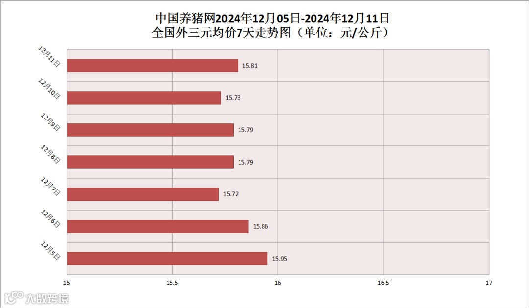 其他生猪品种方面,生猪内三元均价为15.86元/公斤,价格较昨日(15.90元/公斤)下跌了0.04元/公斤;生猪土杂猪均价为15.71元/公斤,价格较昨日(15.73元/公斤)下跌了0.02元/公斤。