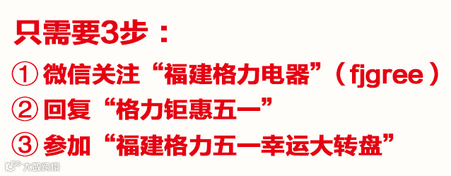 微信关注福建格力电器(fjgree)赢格力空调、豪华电风扇、精品空调被!