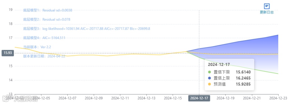 玄田算法是由项目课题组团队原创的非经典逻辑数值聚合理论和不确定性预测方法,构建了基于一致模算子的生猪价格预测模型。该模型采用的聚合函数及一致模相关理论与方法已获得多项国家自然科学基金和省级自然科学资金资助,并获得多项省级自然科学奖奖项。12月17日预测猪价为15.9285,置信区间在15.6140--16.2465之间。12月18日预测猪价为15.8459;12月19日预测猪价为15.8443。
