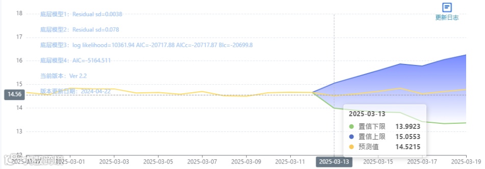 玄田算法是由项目课题组团队原创的非经典逻辑数值聚合理论和不确定性预测方法,构建了基于一致模算子的生猪价格预测模型。该模型采用的聚合函数及一致模相关理论与方法已获得多项国家自然科学基金和省级自然科学资金资助,并获得多项省级自然科学奖奖项。03月13日预测猪价为14.5215,置信区间在13.9923--15.0553之间。03月14日预测猪价为14.6048;03月15日预测猪价为14.7040。