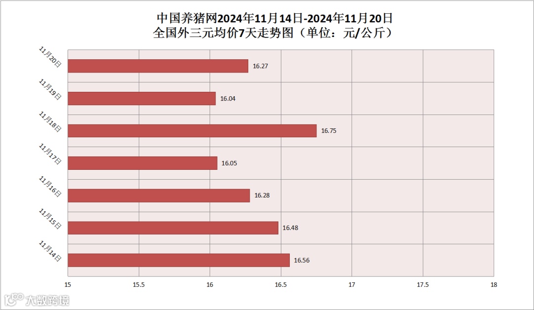 其他生猪品种方面,生猪内三元均价为16.44元/公斤,价格较昨日(16.59元/公斤)下跌了0.15元/公斤;生猪土杂猪均价为16.27元/公斤,价格较昨日(16.44元/公斤)下跌了0.17元/公斤。