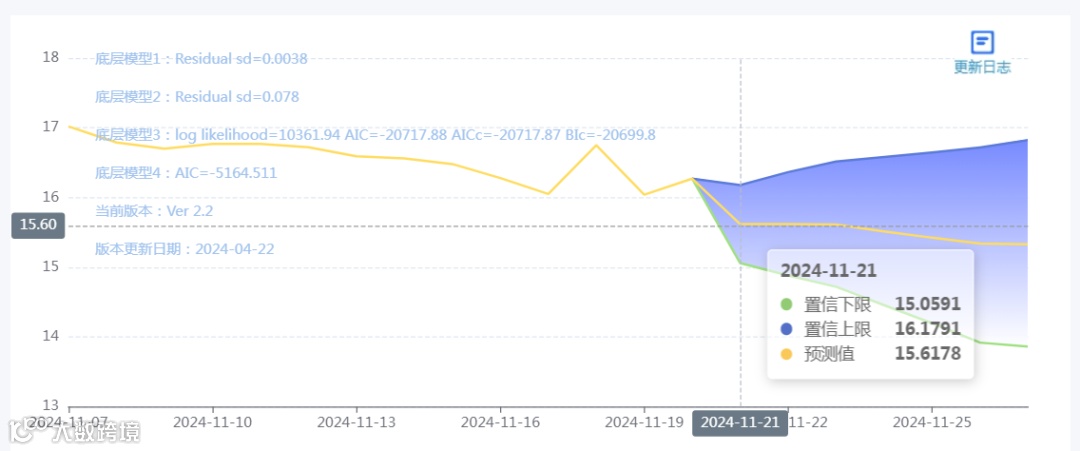 玄田算法是由项目课题组团队原创的非经典逻辑数值聚合理论和不确定性预测方法,构建了基于一致模算子的生猪价格预测模型。该模型采用的聚合函数及一致模相关理论与方法已获得多项国家自然科学基金和省级自然科学资金资助,并获得多项省级自然科学奖奖项。11月21日预测猪价为15.6178,置信区间在15.0591--16.1791之间。11月22日预测猪价为15.6210;11月23日预测猪价为15.6126。