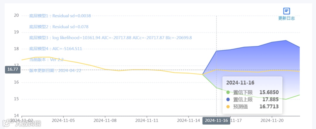 玄田算法是由项目课题组团队原创的非经典逻辑数值聚合理论和不确定性预测方法,构建了基于一致模算子的生猪价格预测模型。该模型采用的聚合函数及一致模相关理论与方法已获得多项国家自然科学基金和省级自然科学资金资助,并获得多项省级自然科学奖奖项。11月16日预测猪价为16.7713,置信区间在15.6850--17.885之间。11月17日预测猪价为16.6868;11月18日预测猪价为16.6657。