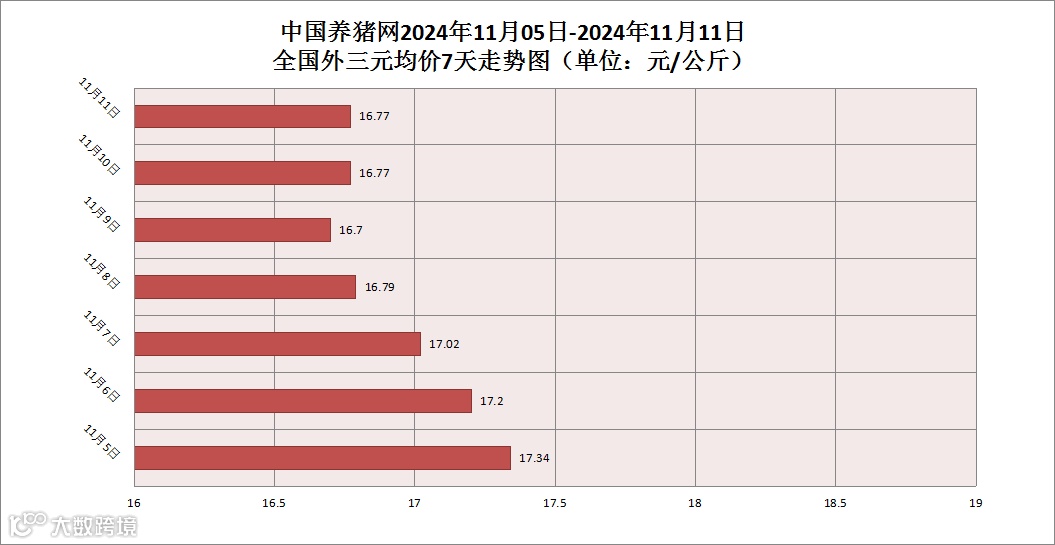 2024年11月11日(星期一),据中国养猪网猪价系统监测,全国外三元均价为16.77元/公斤,报价平稳,较上月(18.17元/公斤)下跌了1.4元/公斤。