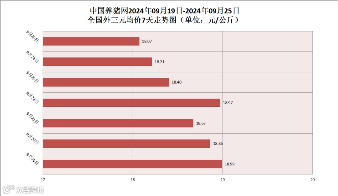 2024年09月25日(星期三),据中国养猪网猪价系统监测,全国外三元均价为18.07元/公斤,猪价较昨日(18.21元/公斤)下跌了0.14元/公斤,较上月(20.08元/公斤)下跌了2.01元/公斤。