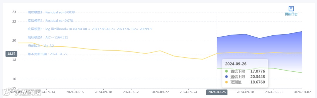 玄田算法是由项目课题组团队原创的非经典逻辑数值聚合理论和不确定性预测方法,构建了基于一致模算子的生猪价格预测模型。该模型采用的聚合函数及一致模相关理论与方法已获得多项国家自然科学基金和省级自然科学资金资助,并获得多项省级自然科学奖奖项。09月26日预测猪价为18.6760,置信区间在17.0776--20.3448之间。09月27日预测猪价为18.7890;09月28日预测猪价为18.7650。