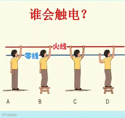 电友A: D触电,A单手搭火线,穿胶鞋,无回路,没触电。B站在凳上单手搭火线没触电,C双手搭火线,无压差,穿胶鞋,没触电,D一手火线一手零线,开成回路,触电。