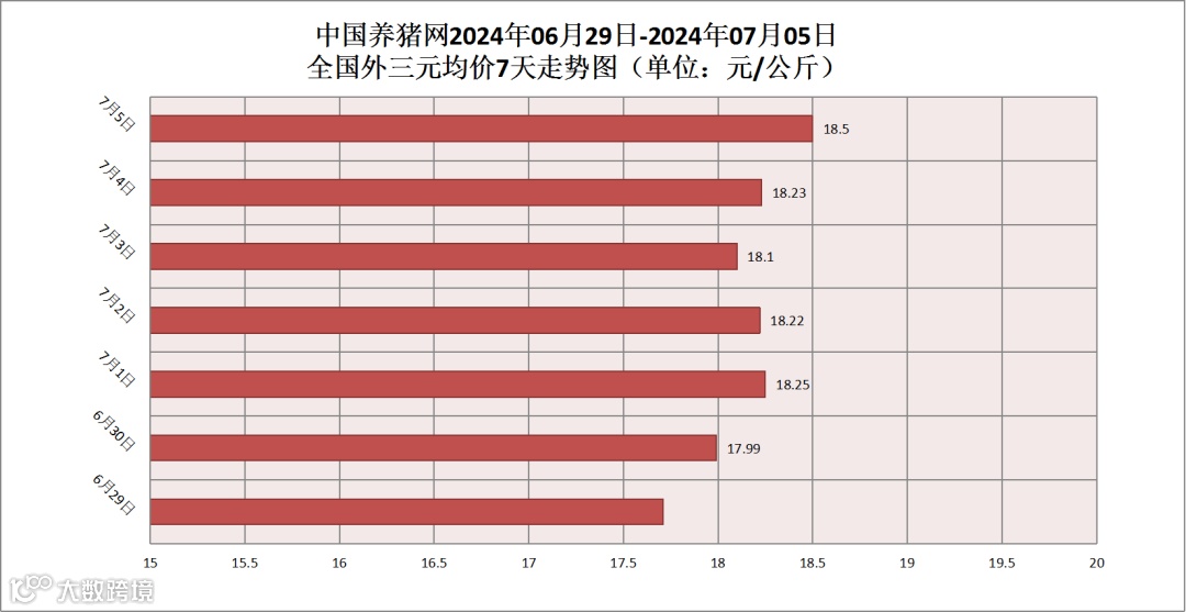 其他生猪品种方面,生猪内三元均价为18.10元/公斤,价格较昨日(17.96元/公斤)上涨了0.14元/公斤;生猪土杂猪均价为17.56元/公斤,价格较昨日(17.50元/公斤)上上涨了0.06元/公斤。