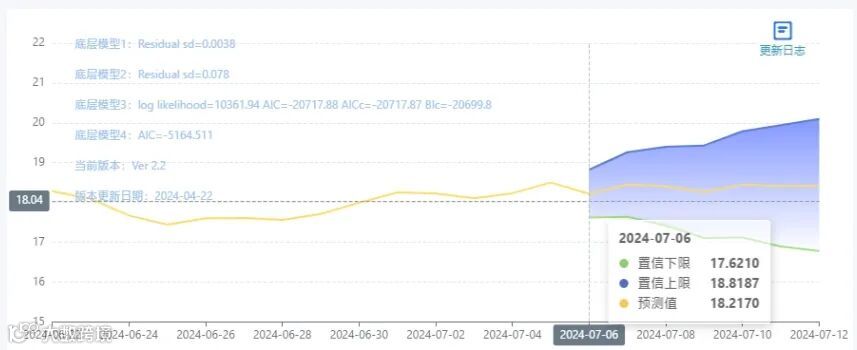 玄田算法是由项目课题组团队原创的非经典逻辑数值聚合理论和不确定性预测方法,构建了基于一致模算子的生猪价格预测模型。该模型采用的聚合函数及一致模相关理论与方法已获得多项国家自然科学基金和省级自然科学资金资助,并获得多项省级自然科学奖奖项。07月06日预测猪价为18.2170,置信区间在17.6210--18.8187之间。07月07日预测猪价为18.4500;07月08日预测猪价为18.4023。