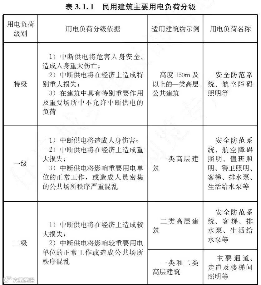 建规和通规规定了一级二级三级负荷使用场景:其实GB51348也有规定,图集也有,写那么多我写着难受读者看着也难受,何必何苦呢,就摘抄一下建规就行了: