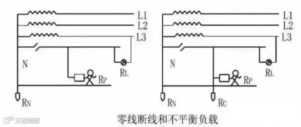 零线断开:当零线断开了以后,原来是零线的部分,现在有可能就带上了和火线一样的电压(比如220V)。当同时满足零线断开,并且用电设备的开关是闭合的,这时候零线就带上了220V的电压,虽然这时候用电设备比如灯泡并没有亮,但是却很危险,这时候触摸原来零线部分就会发生事故。