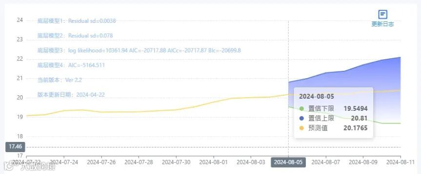 玄田算法是由项目课题组团队原创的非经典逻辑数值聚合理论和不确定性预测方法,构建了基于一致模算子的生猪价格预测模型。该模型采用的聚合函数及一致模相关理论与方法已获得多项国家自然科学基金和省级自然科学资金资助,并获得多项省级自然科学奖奖项。08月05日预测猪价为20.1765,置信区间在19.5494--20.81之间。08月06日预测猪价为20.1457;08月07日预测猪价为20.2524。
