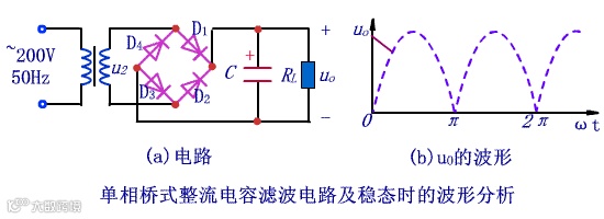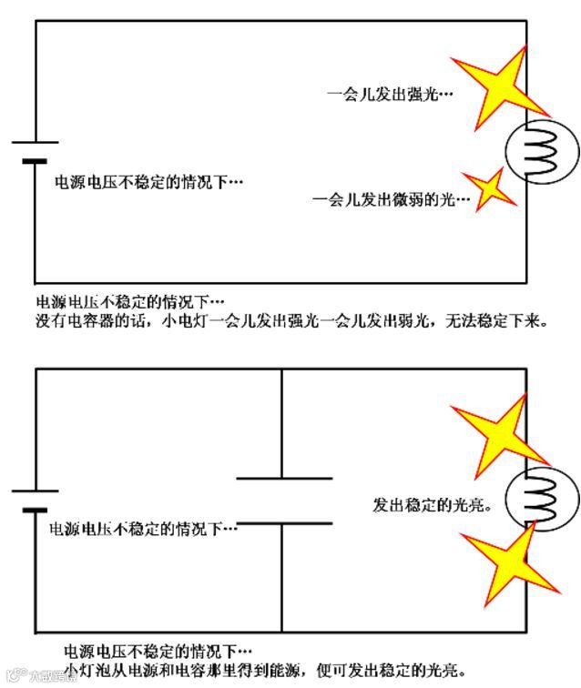 根据电容的状态,电源电压不稳定的情况下,稳定的电灯发光。